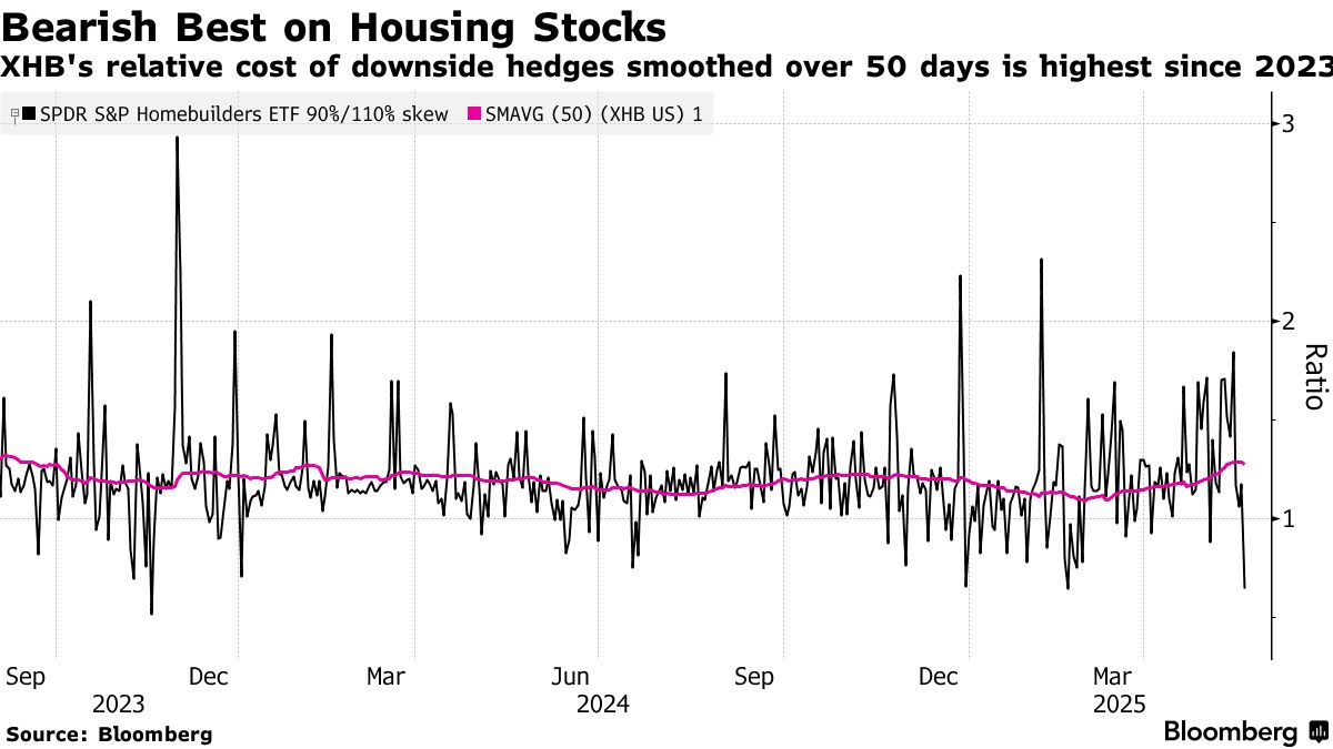 股票期權交易員也在進行類似的押注。消費者必需品精選行業SPDR基金ETF(XLP)下個月下跌10%的保護成本與押注上漲10%的期權成本之比跌破其主要移動平均線,表明投資者並不擔心該行業可能的損失。與此同時,SPDR S&P Homebuilders ETF(XHB)類似比率的50天移動平均線躍升至2024年2月以來的最高水平。