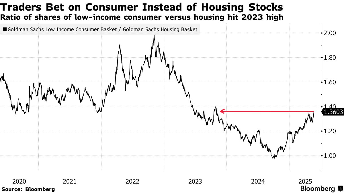 高盛數據顯示,一籃子低收入消費股與房地產的比率躍升至2023年11月以來的最高水平。
