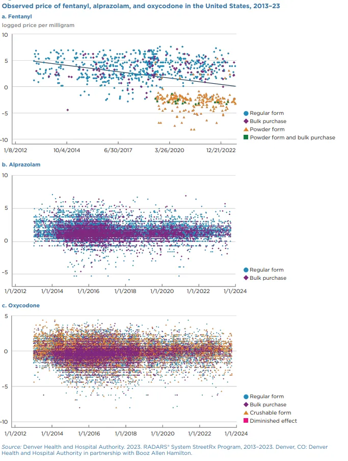 來源:彼得森國際經濟研究所在此背景下,彼得森國際經濟研究所的馬庫斯·諾蘭德、朱麗葉塔·孔特雷拉斯和盧卡斯·倫吉福-凱勒剛剛發表了一篇工作論文,研究了過去中美合作對芬太尼市場和過量用藥死亡的影響。該研究通過分析非法藥品價格數據,基於供需關係估算了芬太尼、羥考酮和阿普唑侖的簡化價格方程,進而評估了芬太尼價格與用藥過量之間的關聯。