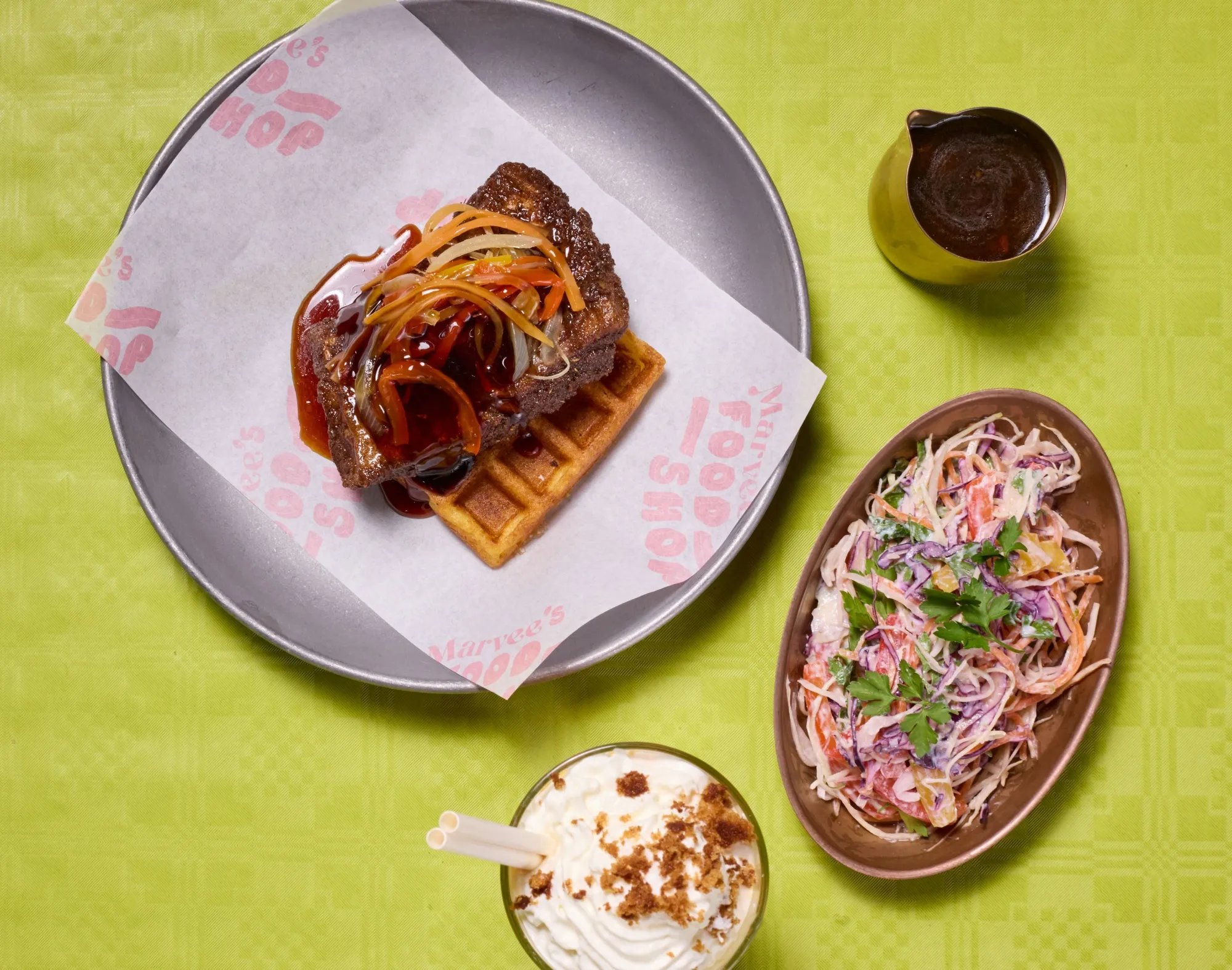 在Marvee’s,節日華夫餅可能會搭配埃斯科維奇魚或黑朗姆酒豬腩肉。圖片來源:Marvee’s Food Shop自泰勒的"Good Front Room"快閃店首次登上頭條近兩年後,他在熱鬧的諾丁山社區開設了餐廳。Marvee美食坊的靈感源自他童年探訪牙買加的經歷,相比在朗廷酒店時期的作品,這裏呈現更隨性的加勒比美食。菜單包含像班米(傳統木薯餅)這樣的加勒比經典,但以華夫餅形式呈現;他的煙燻烤雞搭配辣味米飯和絕妙的大蕉果醬,用甜味平衡煙燻的熾烈風味。泰勒相信他的烹飪將在英國引發廣泛共鳴——這些菜品能喚起幾代英籍加勒比裔人成長記憶中的味道。