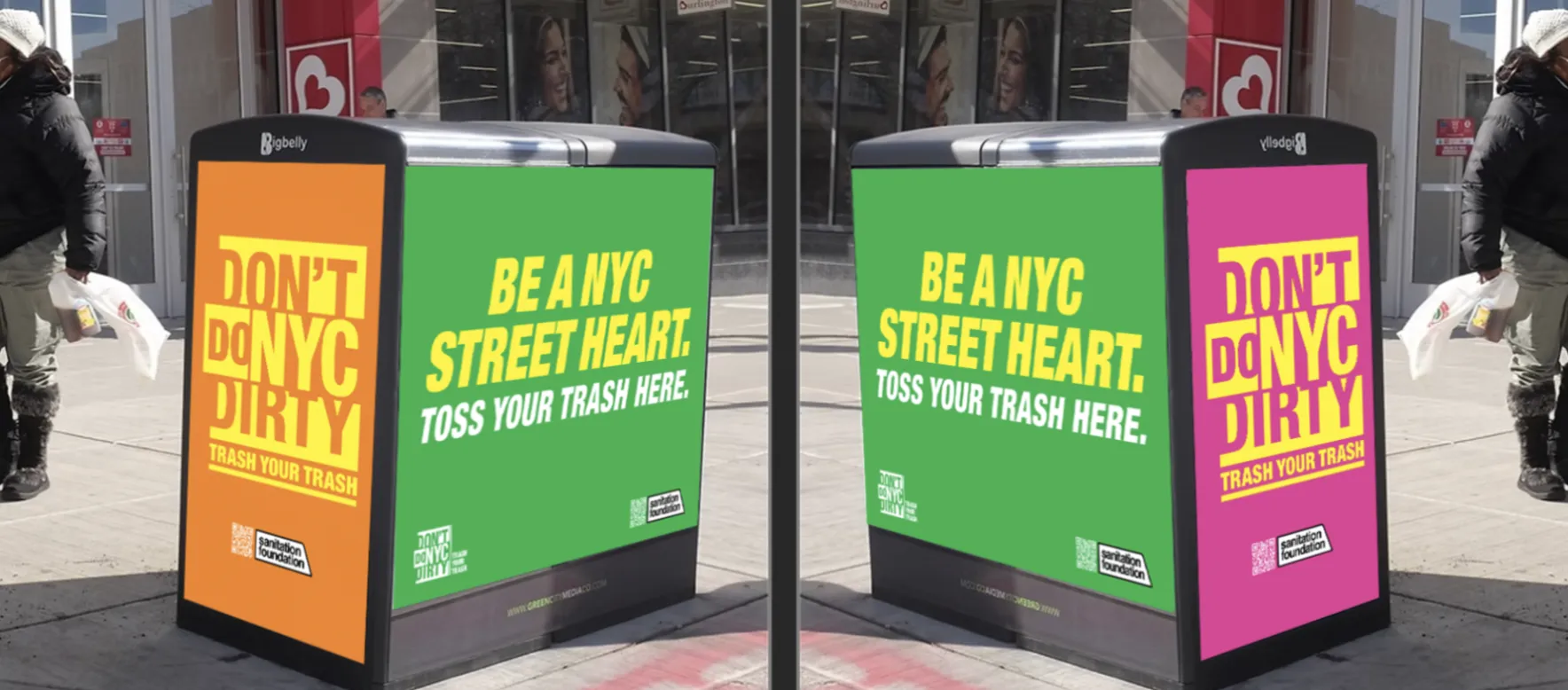 以布魯克林"綠衣女士”(伊麗莎白·斯維特哈特)和康尼島説唱歌手Nems等本地明星為主角的廣告出現在全市的廣告牌、出租車、公交車和垃圾車上。其中一張海報描繪了一位邊看手機邊丟棄空冰咖啡塑料杯的年輕女性,配文"紐約人沒時間瞎折騰”;另一張海報中穿着洋基隊服的父子組合旁,粉紅色標語寫着"條紋衫最懂清潔之道"。