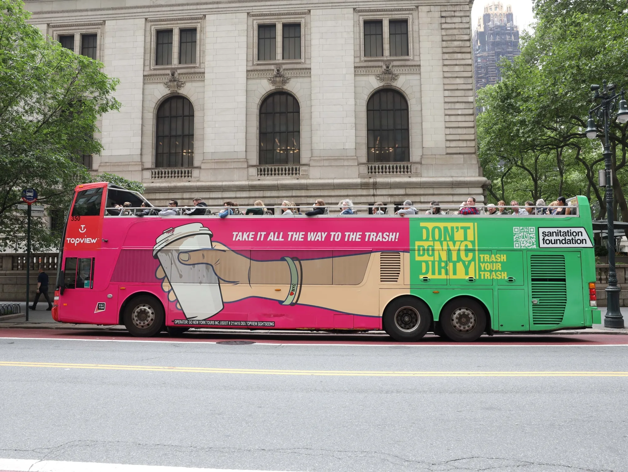 一輛雙層巴士上出現的廣告。由Vector Media提供根據基金會委託進行的一項紐約市民調查,該活動特別針對最可能亂扔垃圾的年輕人。研究發現,儘管80%的人認為亂扔垃圾是城市中的一個問題,但38%的人承認並不總是妥善處理垃圾。研究還發現,“長期亂扔垃圾者”往往是18至24歲的男性。
