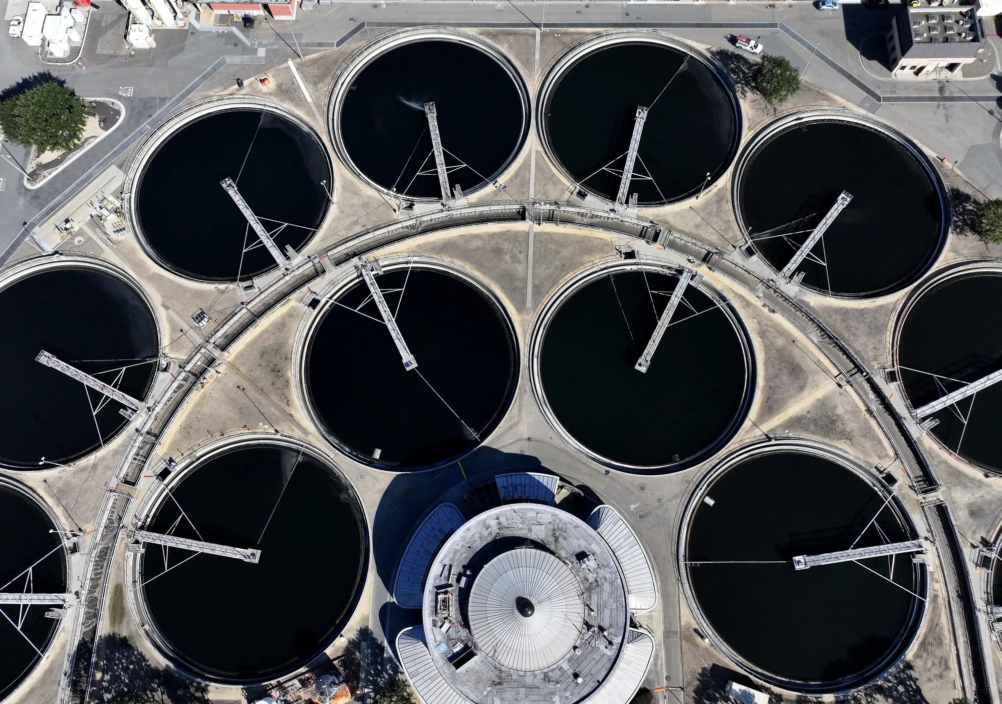 美國加州奧克蘭市東灣市政公用事業區污水處理廠內的蓄水池。
