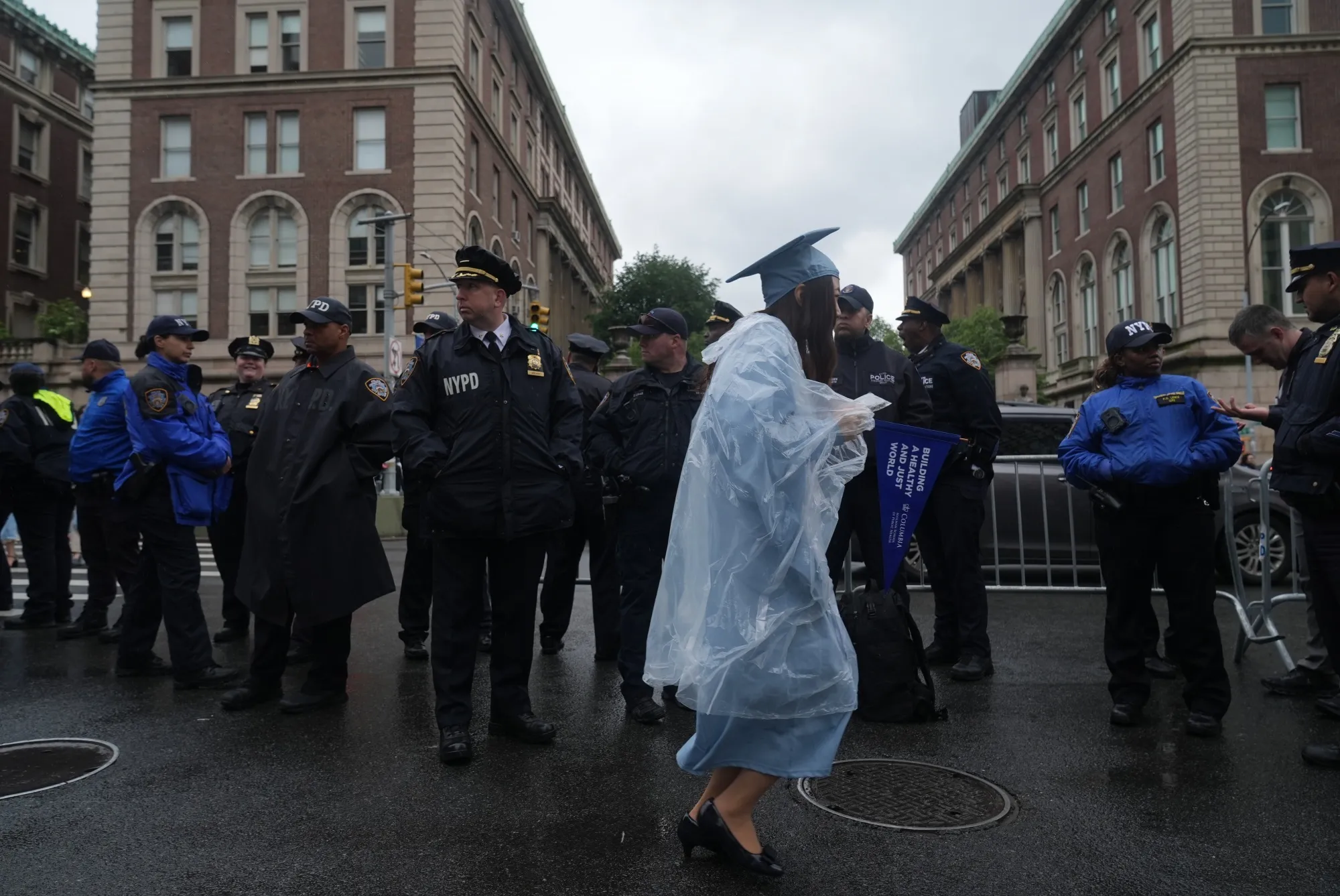 週三畢業典禮的場景凸顯了該校在試圖擺脱動盪和爭議時面臨的棘手道路。雨水淋濕了學生和他們的家人,大批警察監視着大約100名親巴勒斯坦抗議者,他們聚集在百老匯對面被封鎖的校園外,就在許多家庭前往參加畢業典禮時使用的地鐵出口正前方。