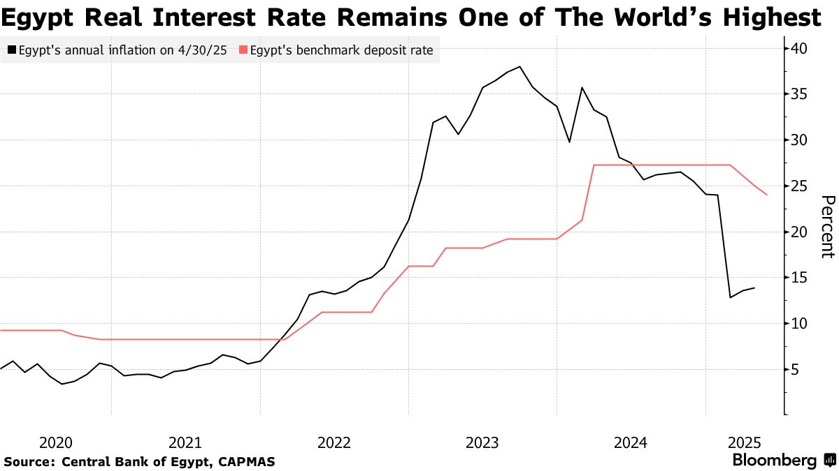 這個中東人口最多的國家在四月降息2.25個百分點——這是近五年來首次貨幣寬鬆。該國曾在2024年3月將基準利率上調至歷史新高,並將貨幣貶值約40%,從而獲得國際貨幣基金組織等機構總計約570億美元的全球紓困資金。