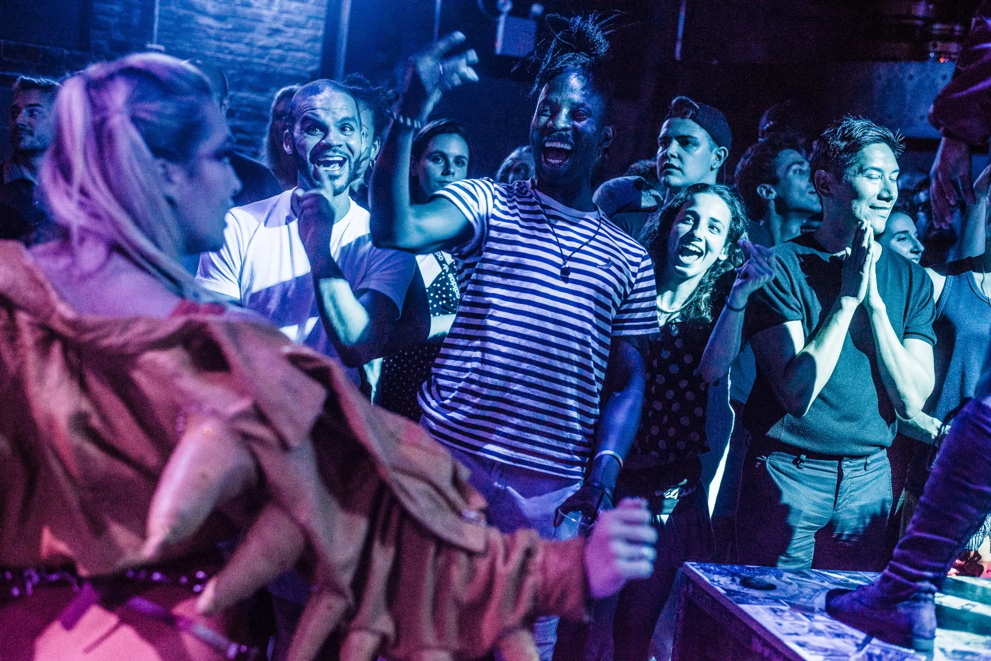 *《王冠下的奧斯卡》*演出時,演員們在布魯克林同志夜店舞動的人羣中及上空表演。攝影師:科裏·裏夫斯為這部戲找投資並不容易。“我試圖邀請很多製作人,但我知道格雷格才是真正懂它的人,“米利考斯基回憶道。諾比萊是個享樂主義者,他在劇院區開了家名為"熱帶怪咖"的鋼琴酒吧。他觀看了《奧斯卡》六場演出中的倒數第二場。