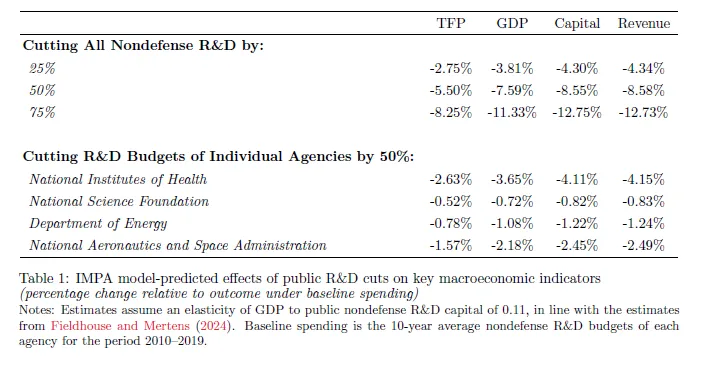 研究人員考察了所有資助非國防研究的主要機構,包括美國宇航局和能源部。他們寫道,公共研發支出減少25%將使國內生產總值下降約3.8%——相當於大衰退期間的GDP降幅。這還將使政府年收入減少約4.3%。