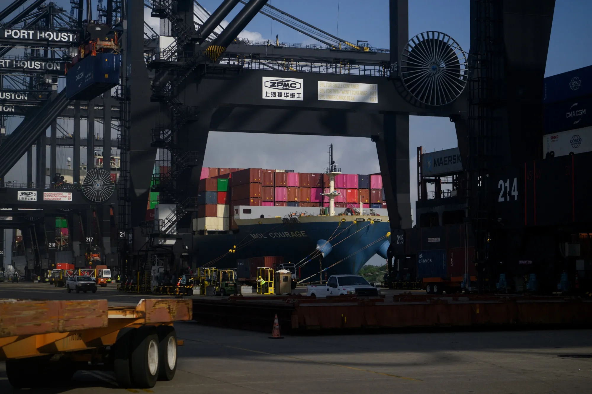 昨日,德克薩斯州西布魯克休斯頓港貝波特集裝箱碼頭,起重機正在為貨輪裝載集裝箱。