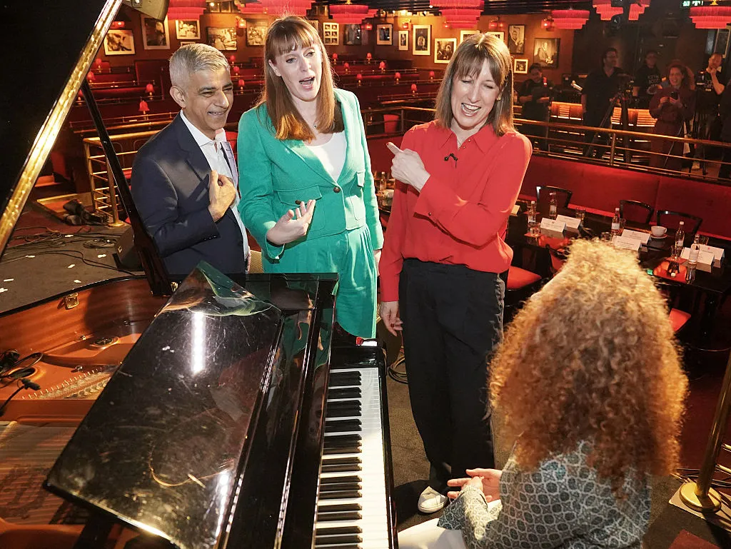 倫敦市長薩迪克·汗爵士、副首相安吉拉·雷納和財政大臣雷切爾·裏夫斯在倫敦羅尼·斯科特爵士俱樂部。