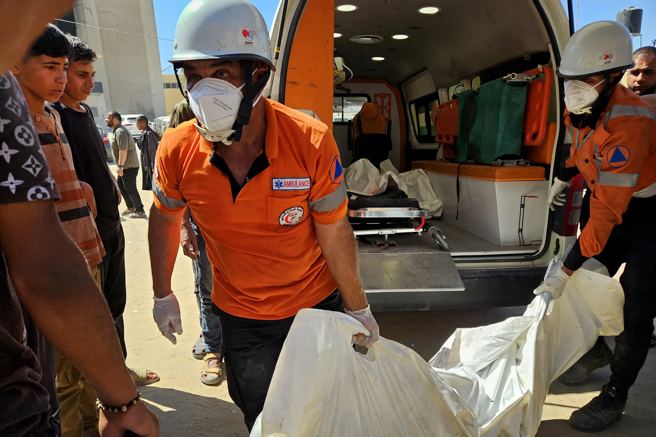 5月23日,以色列空襲加沙南部汗尤尼斯中部居民區後,民防隊伍正在搬運遇難者遺體。