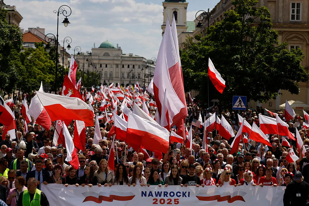 2025年5月25日,卡羅爾·納沃茨基的支持者在華沙集會。攝影師:沃伊切赫·拉迪萬斯基/法新社/蓋蒂圖片社特扎斯科夫斯基在首輪以微弱優勢獲勝後處於守勢,約五分之一的選民選擇了極右翼勢力,他試圖利用自己的家鄉優勢。納沃茨基則寄希望於那些對歐盟和移民持批評立場的選民會支持他。
