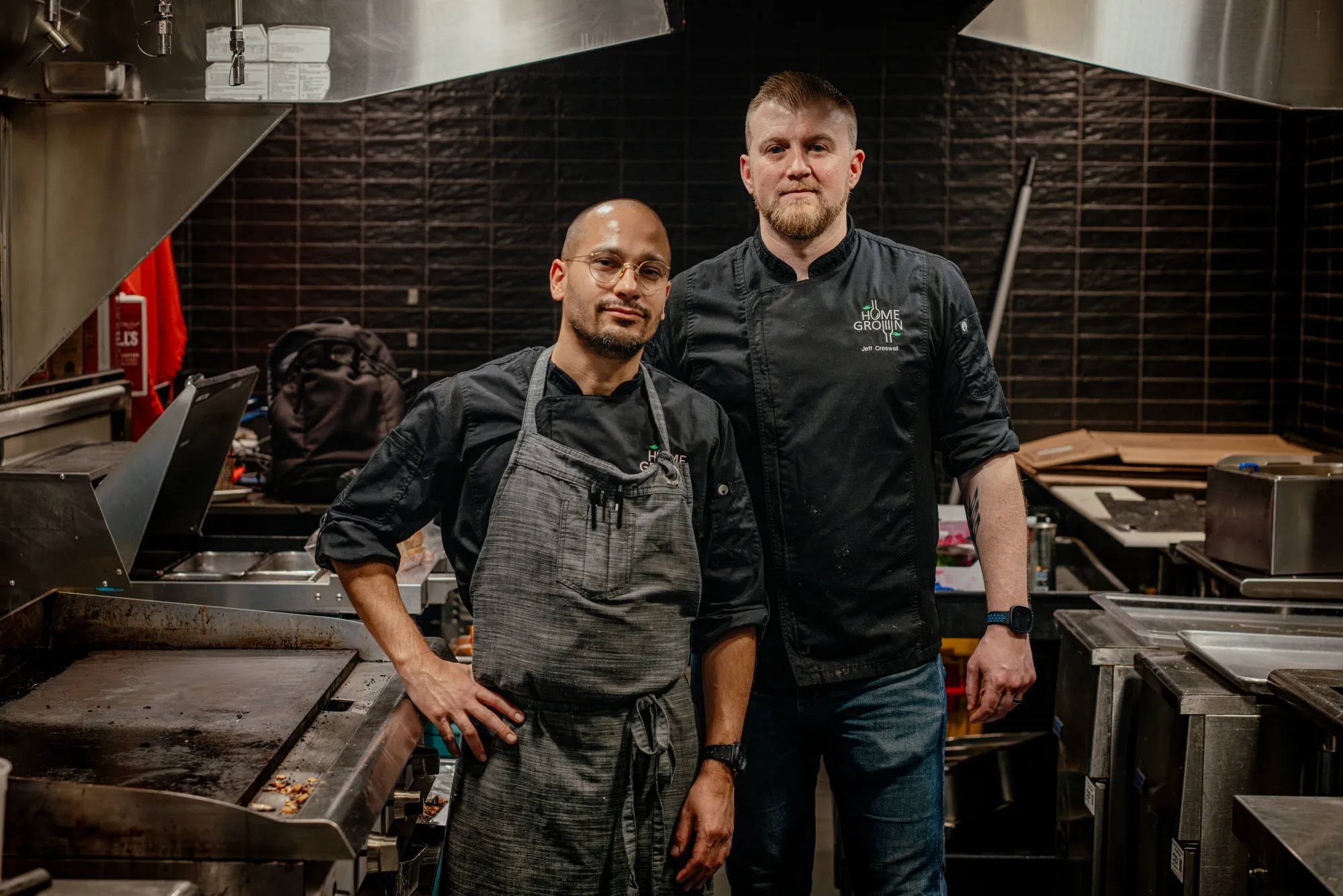 加布裏埃爾·弗里曼(左)和傑夫·克雷斯韋爾用美國本土食材製作菜餚,從威斯康星鱒魚到芝加哥風味西班牙辣香腸。攝影師:傑米·凱爾特·戴維斯/彭博社