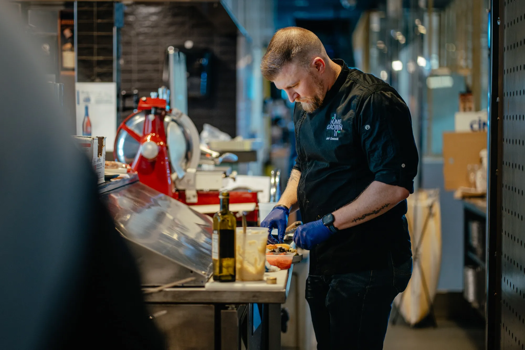 傑夫·克雷斯韋爾在芝加哥西斯科公司的測試廚房裏,用本地食材準備品嚐菜品。