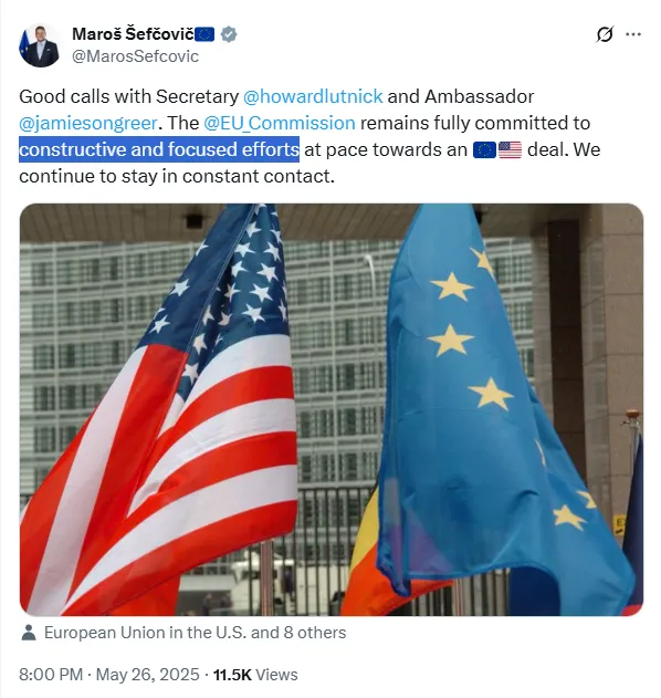 週一,歐盟貿易部長馬洛斯·塞夫科維奇與美國商務部長霍華德·盧特尼克舉行會談,隨後稱此次討論"良好",並重申27國集團對"建設性且聚焦"達成協議的承諾。