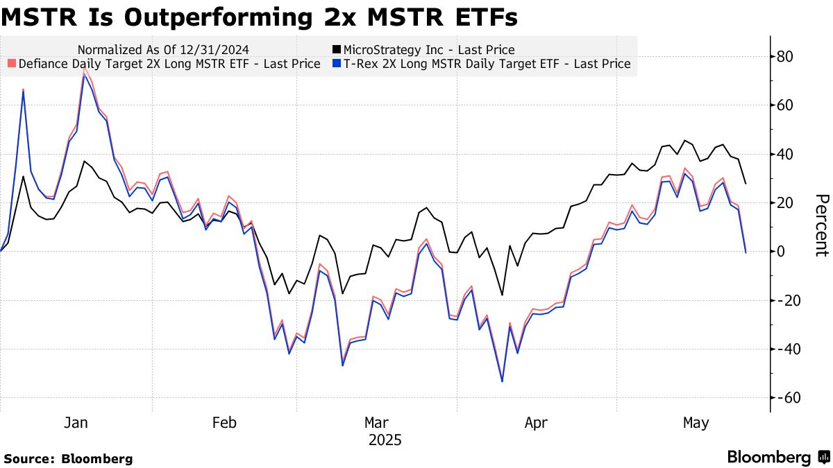 它甚至超越了追蹤該公司自身的雙倍槓桿ETF。MSTX和MSTU——旨在提供股票基礎回報兩倍的產品——今年各自下跌約1%。這些基金每個交易日都會重置風險敞口,因此即使在上漲趨勢中,波動的價格走勢也可能削弱長期回報——這種現象被稱為波動性拖累。