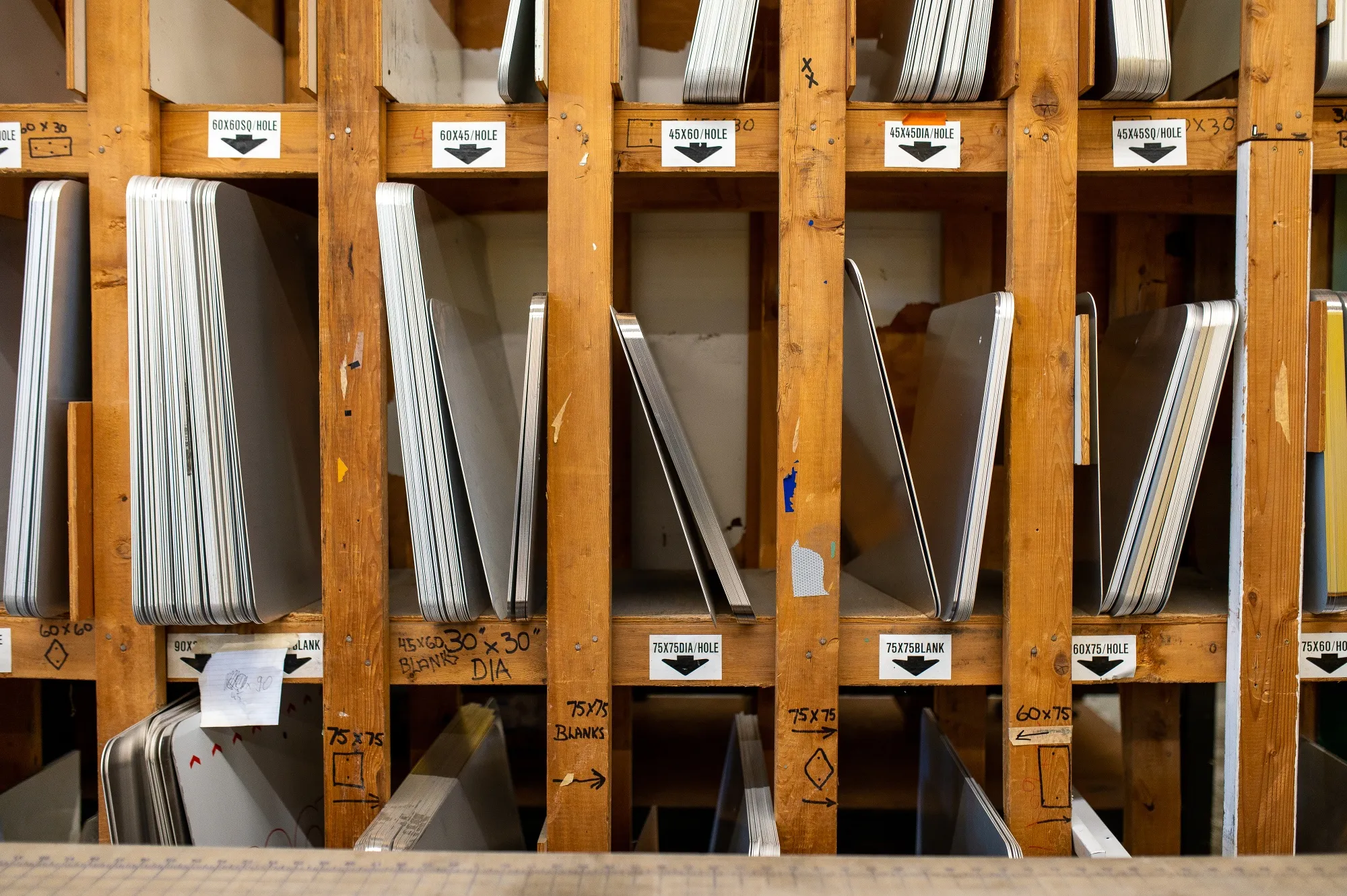 加拿大不列顛哥倫比亞省蘭福德市一家制造工廠內切割鋁製標識的場景。