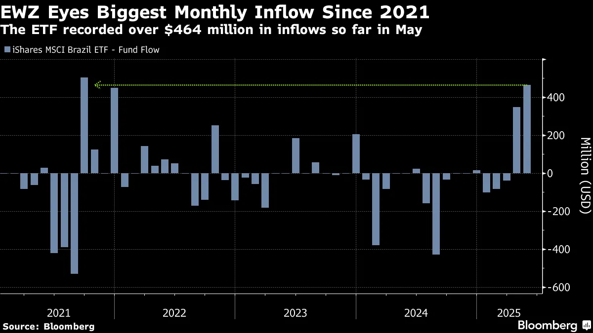 這隻被稱為EWZ的ETF在5月迄今已獲得超過4.64億美元資金流入,正邁向自2021年9月以來最大的月度淨流入。根據彭博彙編的數據,今年迄今該ETF已錄得超過5.86億美元資金流入。