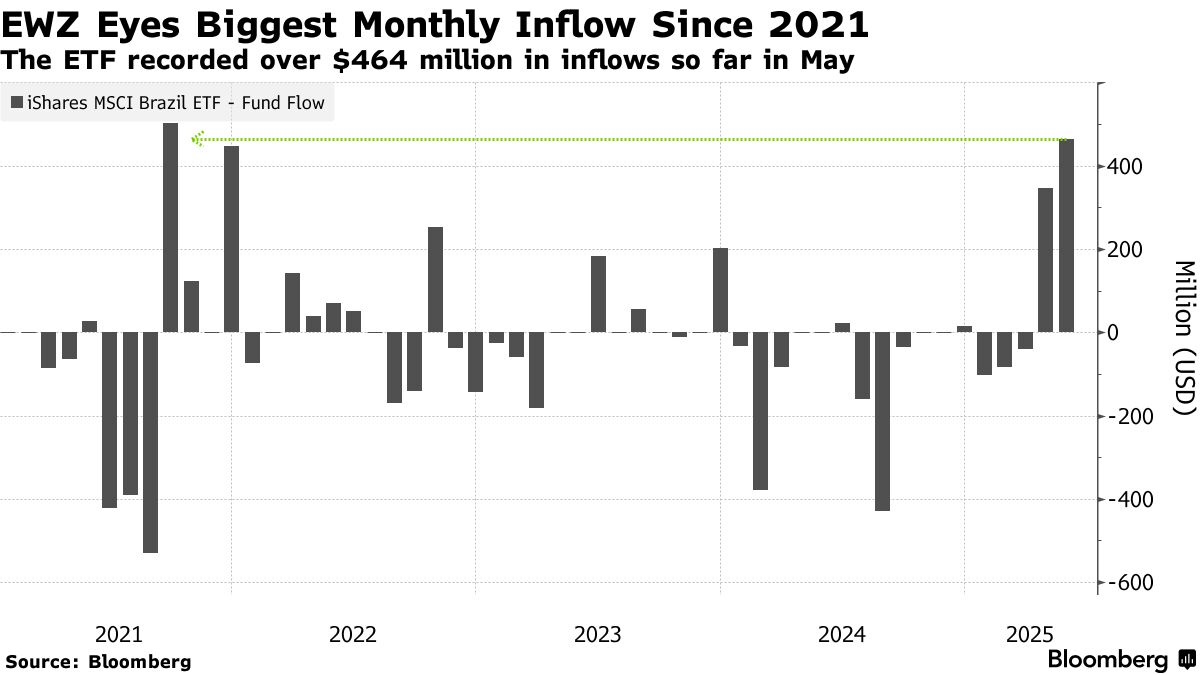 這隻簡稱EWZ的交易所交易基金在5月已獲得超過4.64億美元資金流入,正邁向自2021年9月以來最大的單月淨流入。彭博彙編數據顯示,今年以來該ETF已錄得逾5.86億美元資金流入。