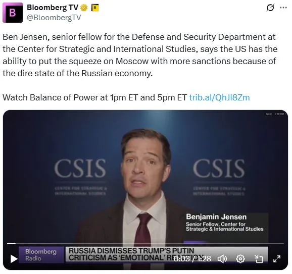 今天下午1點,彭博電視台《權力平衡》早間版節目中,主持人喬·馬修和凱莉·萊因茨採訪了戰略與國際研究中心國防與安全部門高級研究員本·詹森,探討特朗普與弗拉基米爾·普京之間日益緊張的局勢。