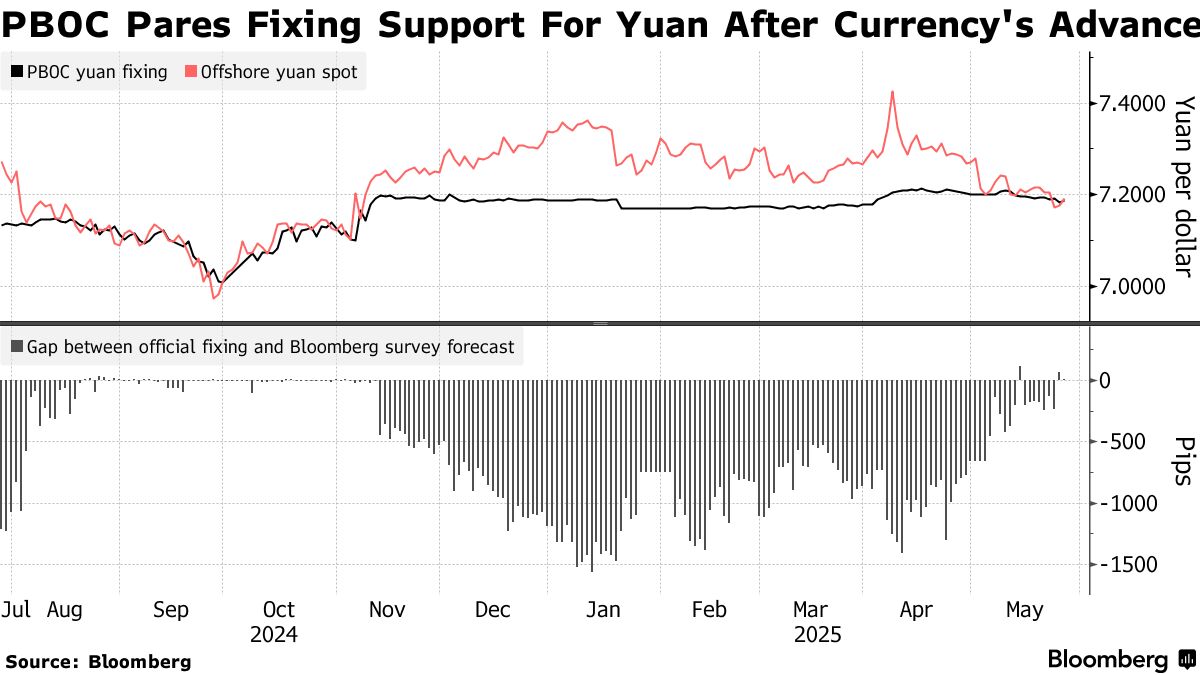 北京與華盛頓的關税休戰提振了人民幣匯率,幫助人民幣較4月份創下的18年低點上漲逾2%。這輪上漲給中國央行提供了減少人民幣防禦力度的空間。