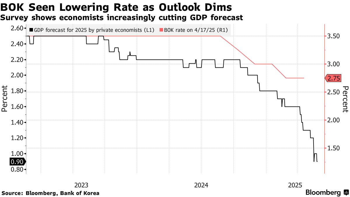 韓國央行今年修正後的經濟預測預計將較2月份1.5%的預期大幅下調。彭博社調查的經濟學家認為,由於消費疲軟、出口低迷和投資者信心受挫削弱了經濟活動,2025年經濟增速將放緩至0.9%。
