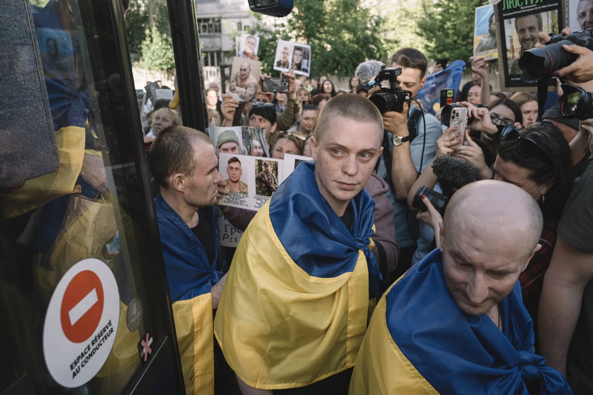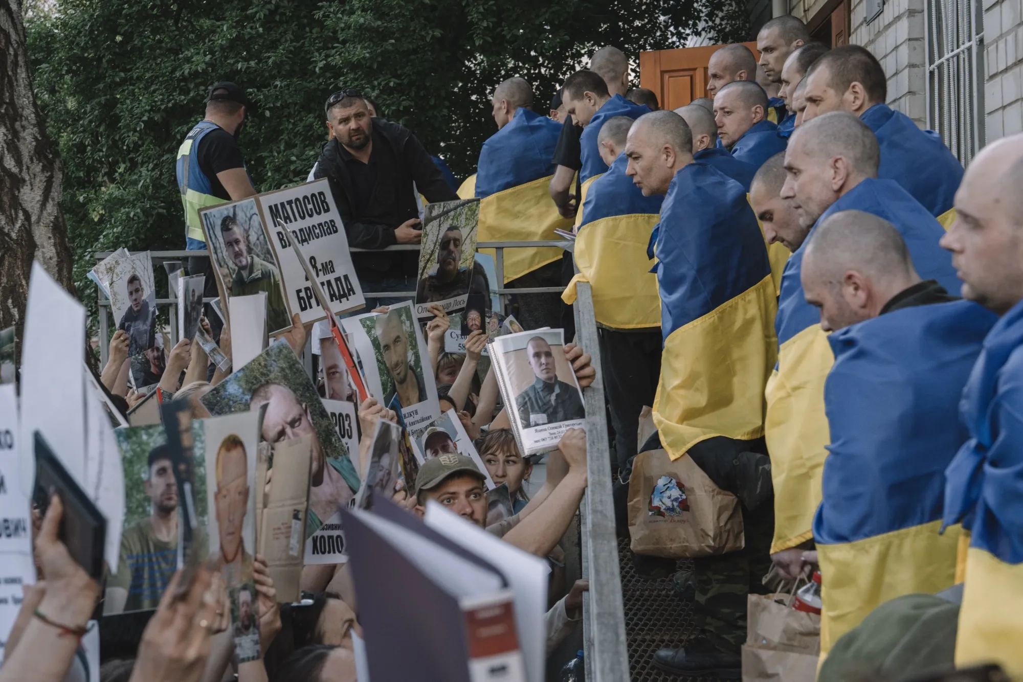 週五,在烏克蘭一處未公開地點,親屬和軍方人員迎接與俄羅斯進行大規模戰俘交換後歸來的烏克蘭軍人。