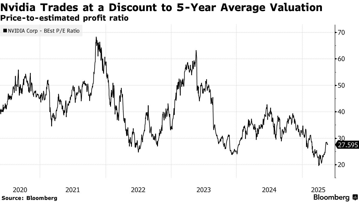 儘管英偉達股價反彈,但其相對於預期收益的估值仍處於折價狀態。根據彭博彙編的數據,英偉達的股價是未來12個月預期利潤的29倍,而五年平均值為40倍。納斯達克100指數的預期市盈率約為26倍。