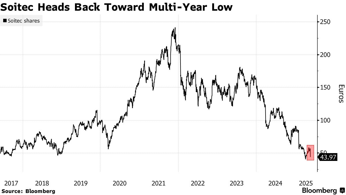 法國半導體行業供應商Soitec的股價暴跌,此前該公司報告第四季度銷售額下降,並因市場不確定性撤回了前瞻性指引。