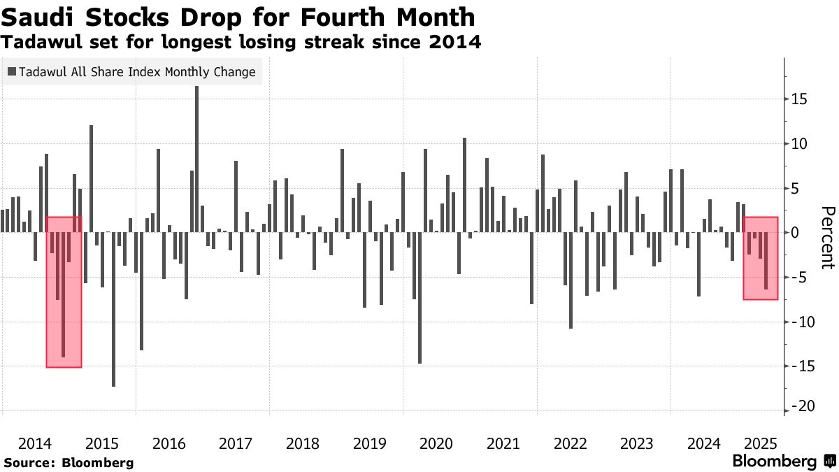 截至週二收盤,沙特全股指數5月累計下跌6.4%,在彭博追蹤的92個股票基準指數中跌幅居首。該指數已連續四個月下挫,創下2014年以來最長連跌紀錄。這與整體新興市場指數形成鮮明對比——後者正邁向去年9月以來最佳單月表現,並有望創下近一年最長連漲週期。