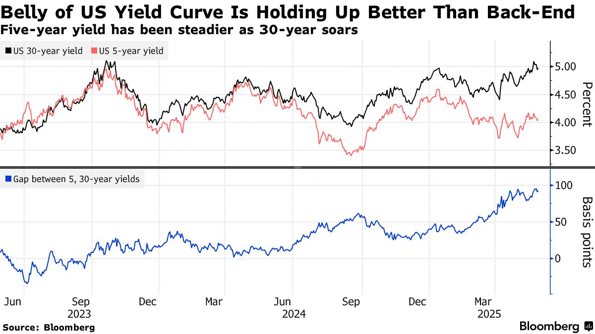 上週美國30年期國債收益率觸及5.15%,創2023年10月以來新高。5年期與30年期收益率利差已突破90個基點,接近2021年以來最高水平。