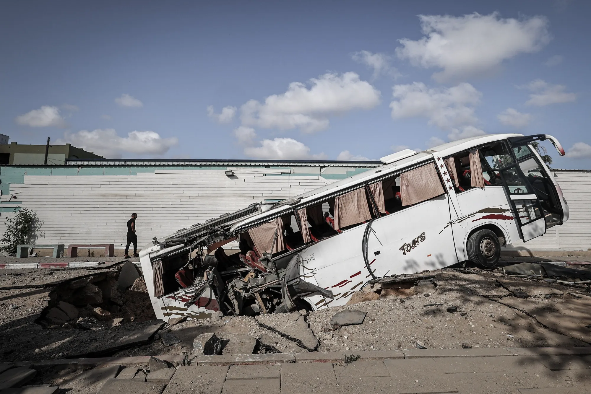 5月14日,加沙汗尤尼斯歐洲醫院外,一輛被以色列空襲摧毀的巴士。攝影師:艾哈邁德·薩利姆/彭博社以色列證實擊斃了哈馬斯在加沙的最高指揮官,印證了本月初的相關報道。