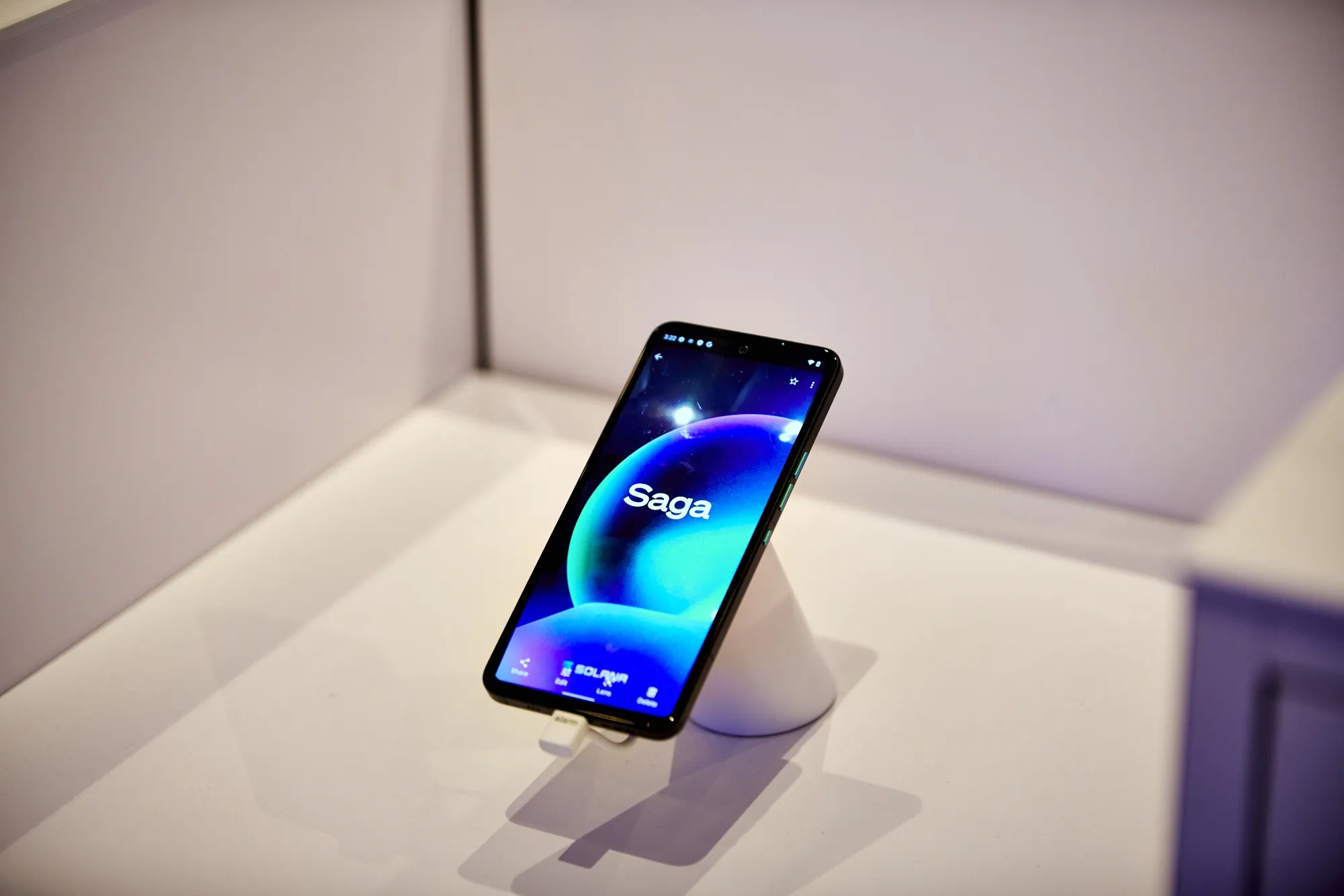 美國紐約哈德遜廣場Solana Space零售店內展示的Solana Saga安卓手機。