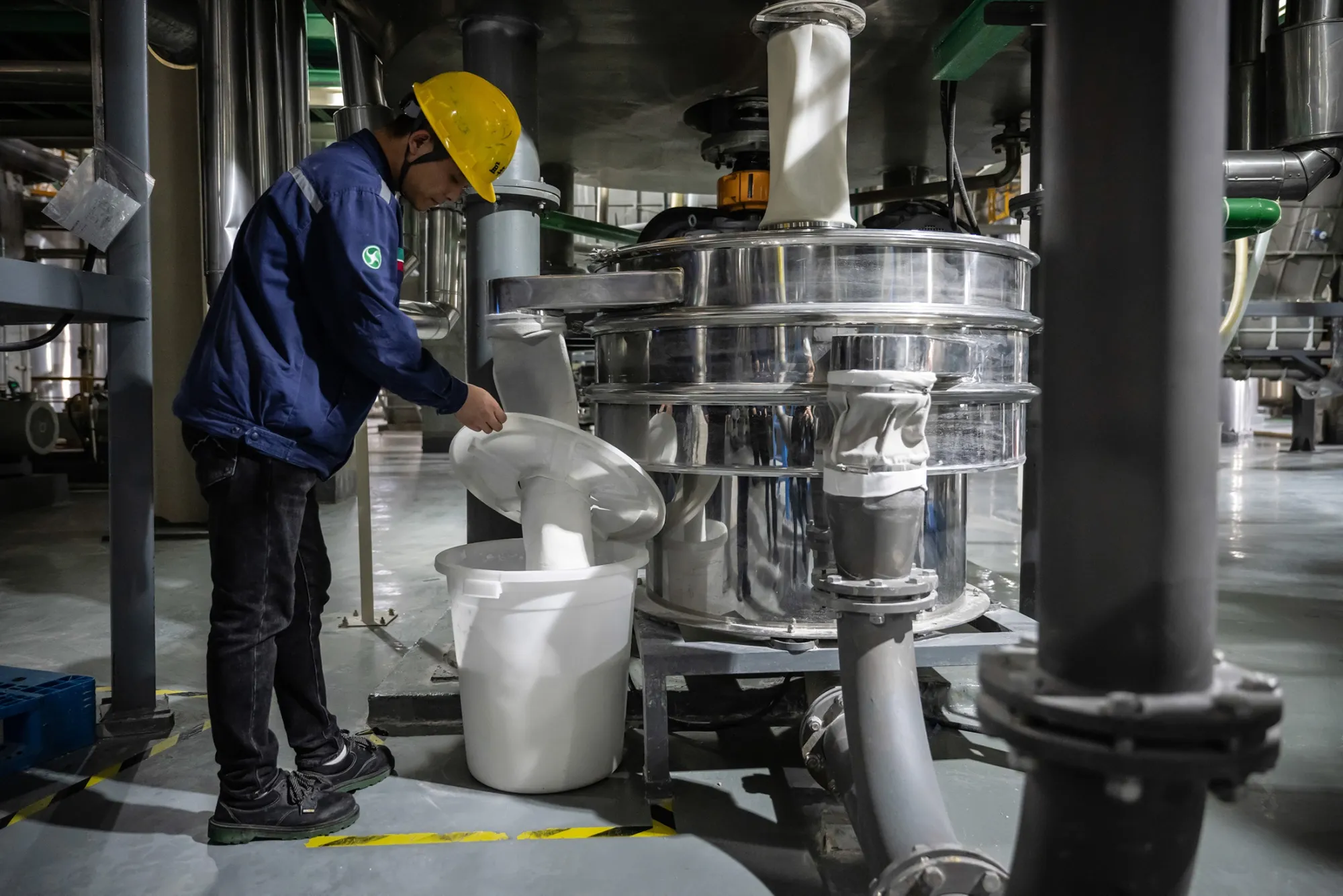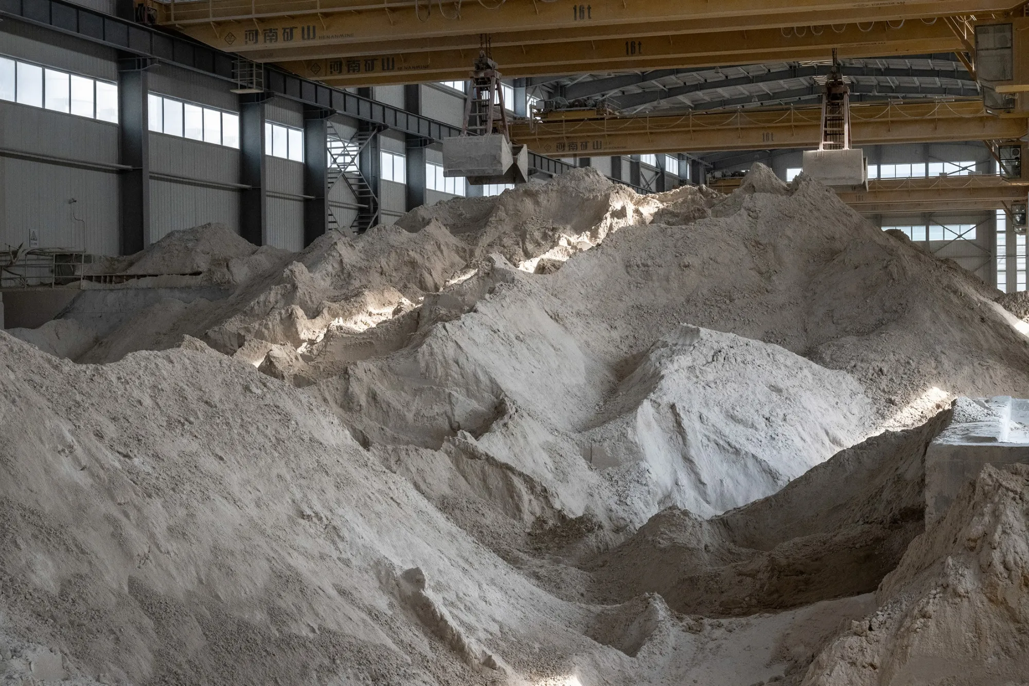 在宜春郊外,由寧德時代與正極材料製造商江蘇龍蟠科技合資建設的精煉廠每日仍接收數百輛貨車。礦石經破碎研磨成細沙後,被傾倒入航母大小的倉庫堆場,經化學噴淋、高温處理和離心分離等工序,最終轉化為可用於電池製造的碳酸鋰。