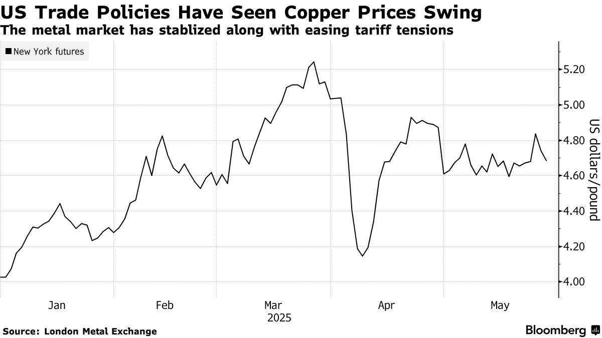 季度預測延期發佈以便官員更充分分析近期銅價劇烈波動。當前美國期貨交易價略低於4.70美元/磅,3月下旬因關税前搶運潮曾飆升至5.20美元以上的歷史高位,兩週後特朗普政府公佈新關税政策又暴跌至4.20美元下方。