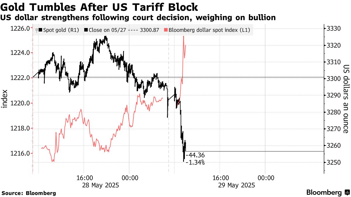 美國貿易法院的裁決是特朗普激進關税議程引發的市場不確定性中的最新轉折,這一議程已促使投資者轉向黃金這一傳統避險資產尋求安全。儘管當前金價較上月創下的歷史高點低約240美元,但得益於央行購金,今年黃金仍上漲逾四分之一。