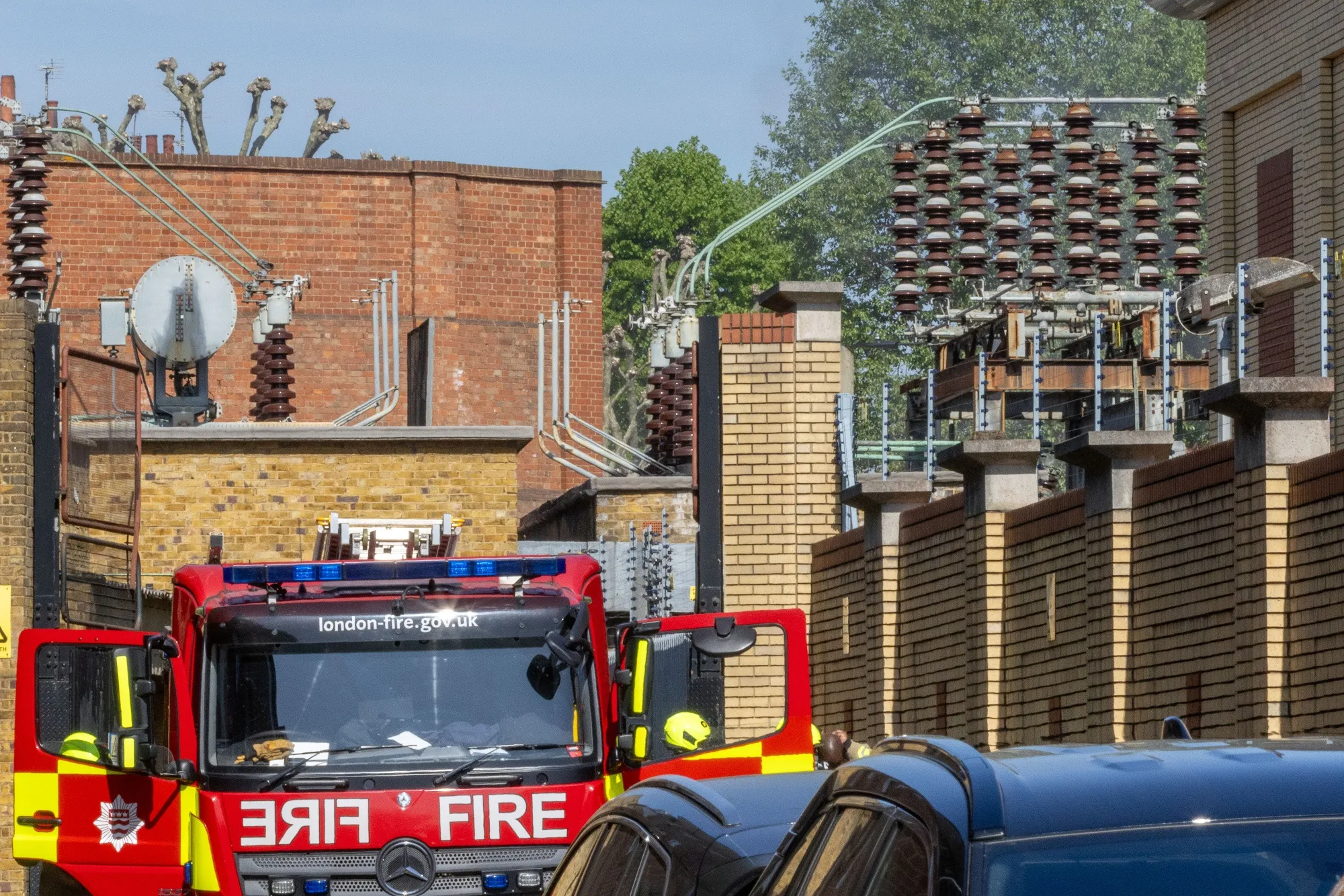 2025年4月29日,倫敦一座變電站火災現場的緊急救援人員。