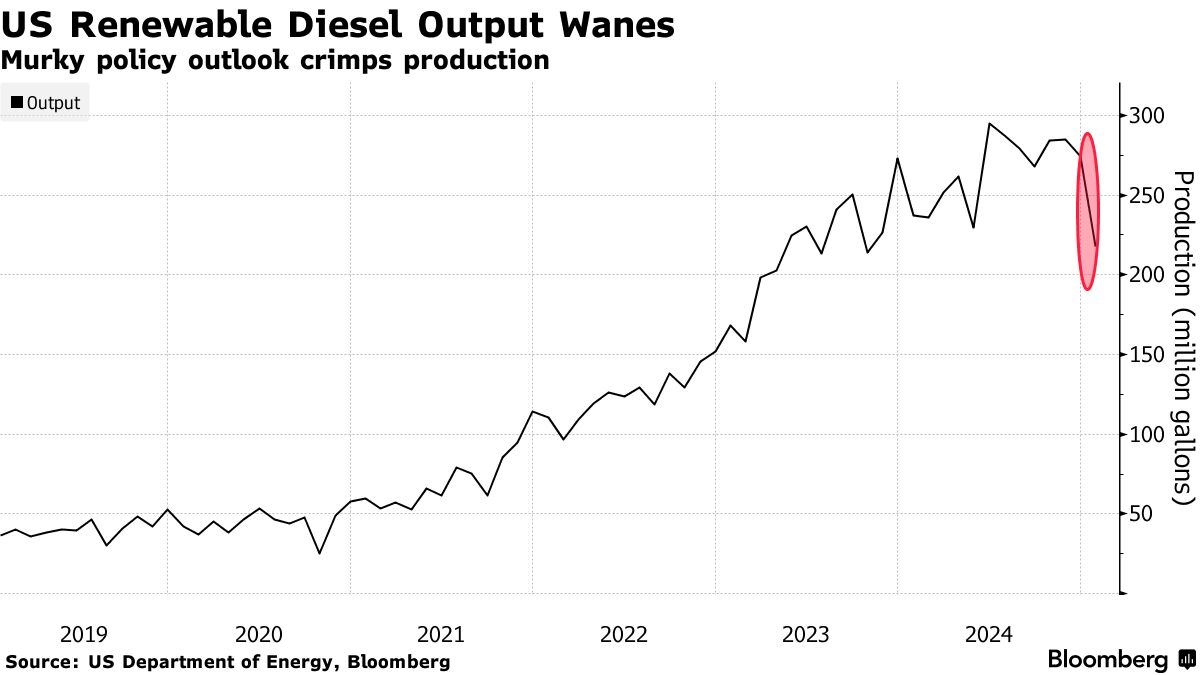 這導致多家工廠關閉。彭博行業研究項目追蹤數據顯示,截至4月,美國生物柴油工廠的產能利用率僅為51%,而生產可再生柴油(一種化學成分與化石燃料相同的燃料)的設施運行率為72%。