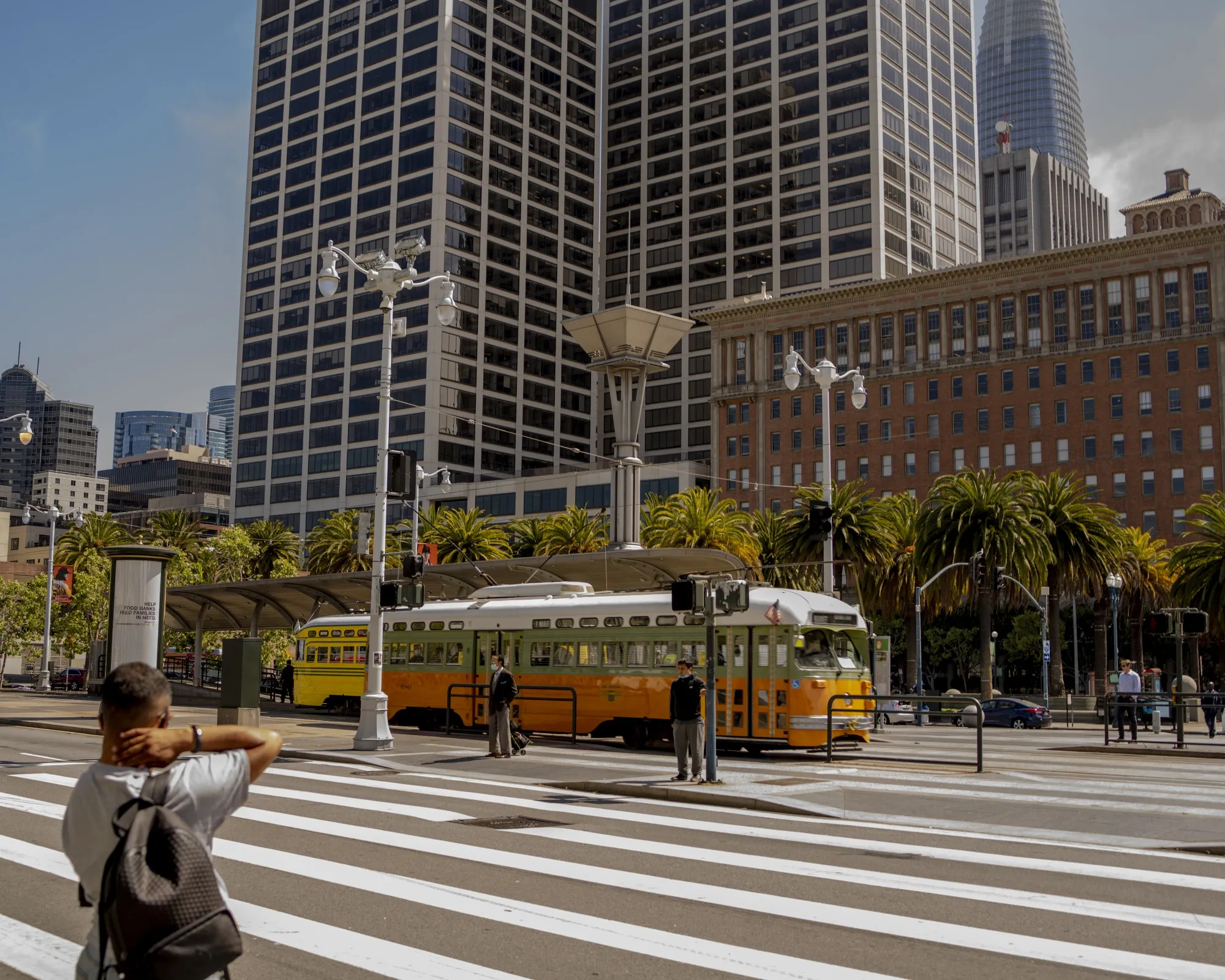 舊金山Embarcadero廣場的有軌電車。該地區的優勢,包括受過良好教育的勞動力和風險資本投資的可獲得性,持續吸引着初創企業,尤其是那些從事人工智能領域的公司。
