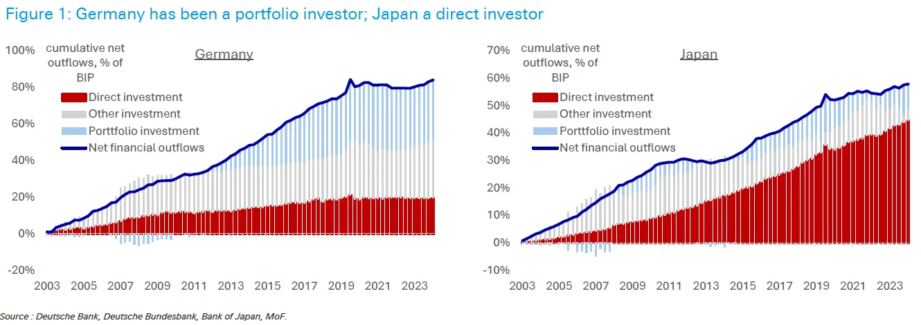 本週數據顯示,德國自1991年以來首次成為全球最大淨債權國,於去年超越日本。但德意志銀行分析指出,兩國在積累海外資產的方式上存在顯著差異。