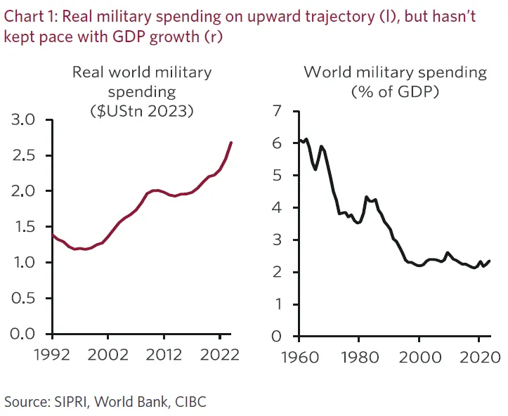 “大量研究表明,這純粹是擠入效應而非擠出效應。研發佔國防總支出的比重越大,產生的正向溢出效應就越顯著,”CIBC經濟學家寫道。