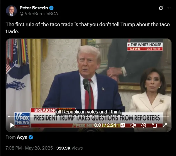 所謂的TACO交易——即特朗普總是臨陣退縮(Trump Always Chickens Out)——是由一位《金融時報》專欄作家創造的,用來描述投資者在總統發出關税威脅後抓住市場暴跌機會,預測他最終會妥協而股市將反彈的做法。