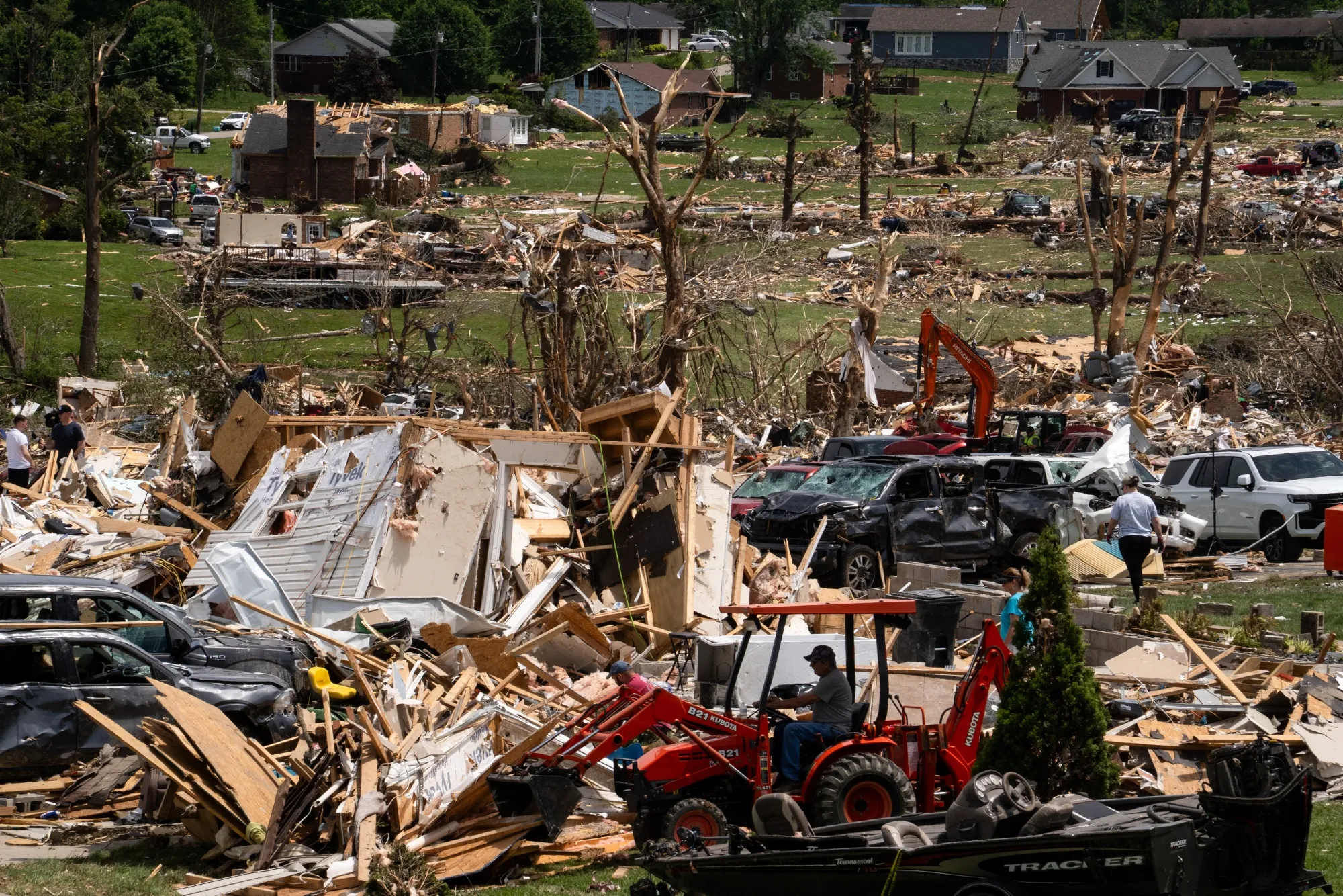 5月18日,工人們正在清理肯塔基州倫敦市外的龍捲風殘骸。攝影師:Michael Swensen/Getty Images除這兩項拒絕外,過去兩個月政府還暫緩批准另外11項類似申請,儘管同期通過了各州災後援助計劃的其他部分。據愛荷華、堪薩斯、肯塔基、密西西比、密蘇里、內布拉斯加、俄克拉荷馬、德克薩斯和阿肯色州官員透露,聯邦應急管理局仍在審核其申請材料,其中阿肯色州正在等待針對新近災害的第二次申請回復。除肯塔基和堪薩斯外,這些州均由共和黨人擔任州長。