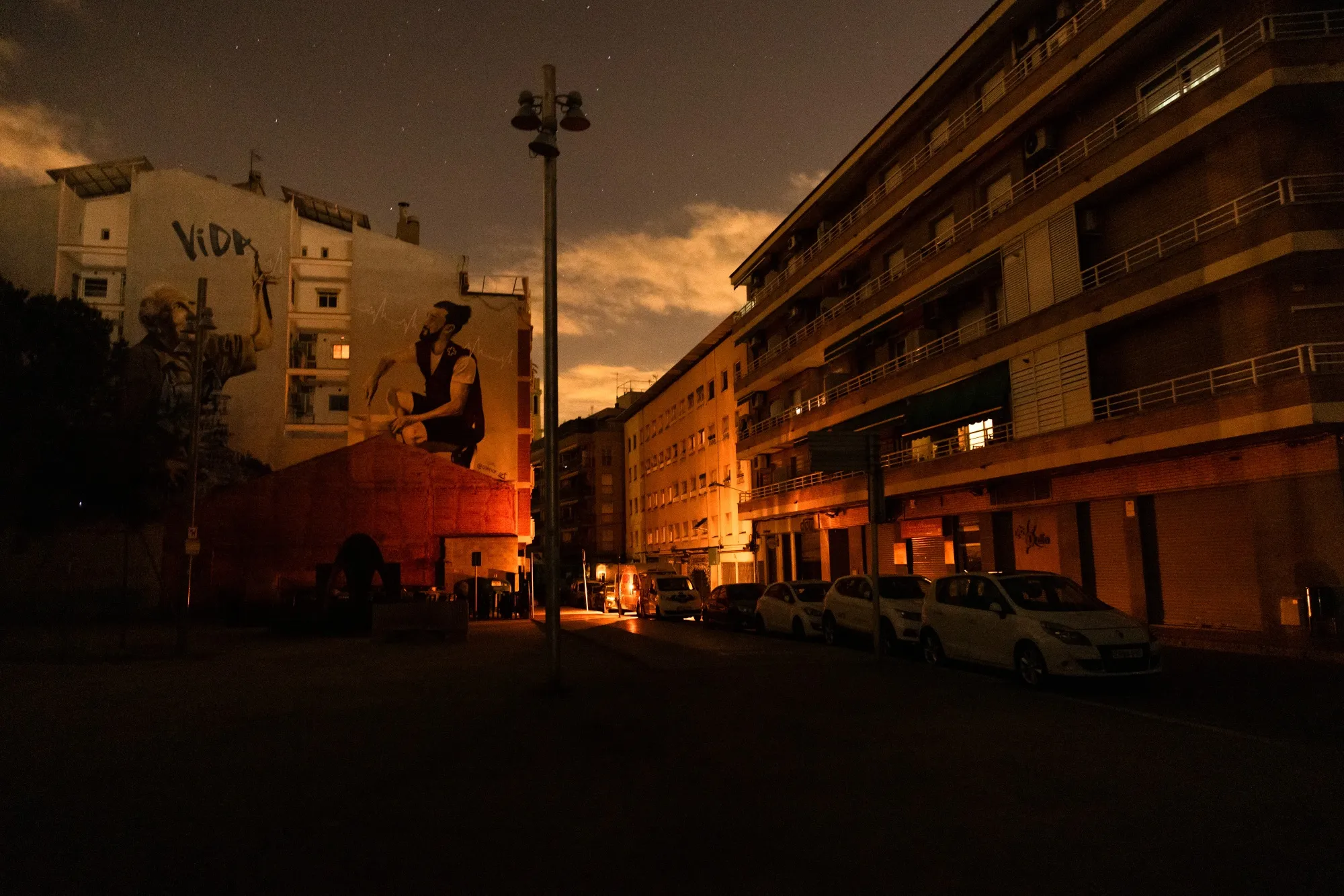 4月28日,西班牙莫林斯德雷伊停電期間一條未照明的住宅街道。