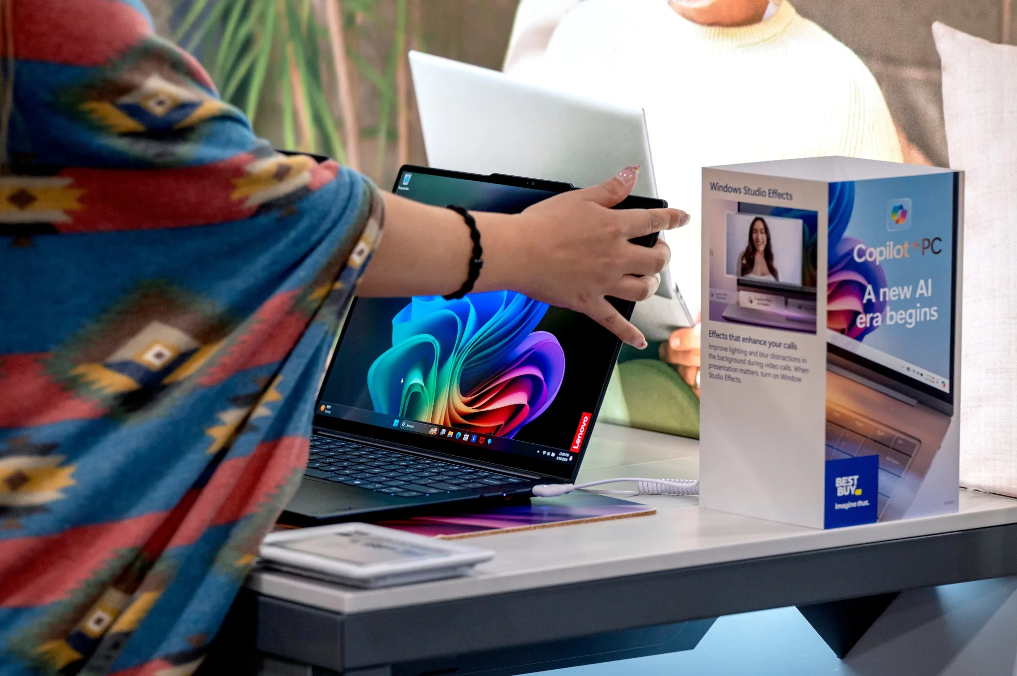 一位顧客在美國加州聯合市使用搭載微軟Copilot+ PC的電腦。