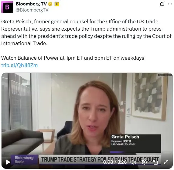 今天下午1點,彭博電視台《權力平衡》早間節目的主持人喬·馬修和凱莉·萊因茨採訪了美國貿易代表辦公室前總法律顧問格雷塔·佩施,探討了貿易法庭對特朗普關税裁決的影響。