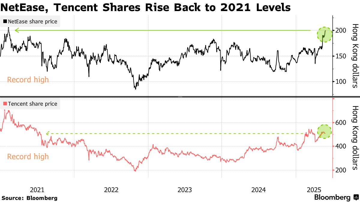 網易股價飆升45%,騰訊上漲22%,得益於經典遊戲表現強勁。網易表示其生存恐怖遊戲《第五人格》玩家數創季度新高,而自去年協助重返中國市場後,《魔獸世界》熱度持續攀升。騰訊公佈《王者榮耀》與《穿越火線手遊》一季度收入創紀錄。