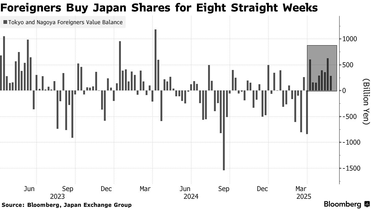截至5月23日當週,外國投資者買入2850億日元(20億美元)股票,自4月初唐納德·特朗普宣佈加徵關税以來,他們的淨買入總額已達2.86萬億日元。