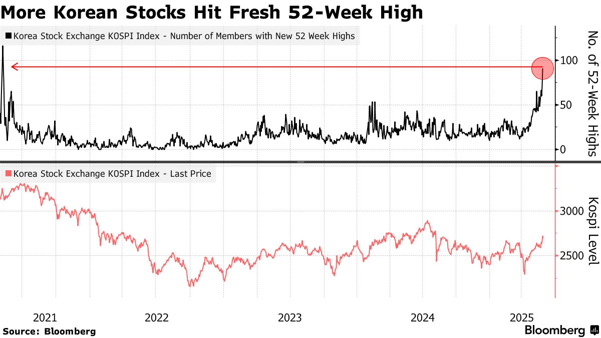 儘管基準Kospi指數較去年高點仍有6%以上的差距,但彭博彙編數據顯示,週四有91只成分股觸及52周新高。這是自2021年5月以來單日最高紀錄,當時Kospi指數正邁向歷史高點。