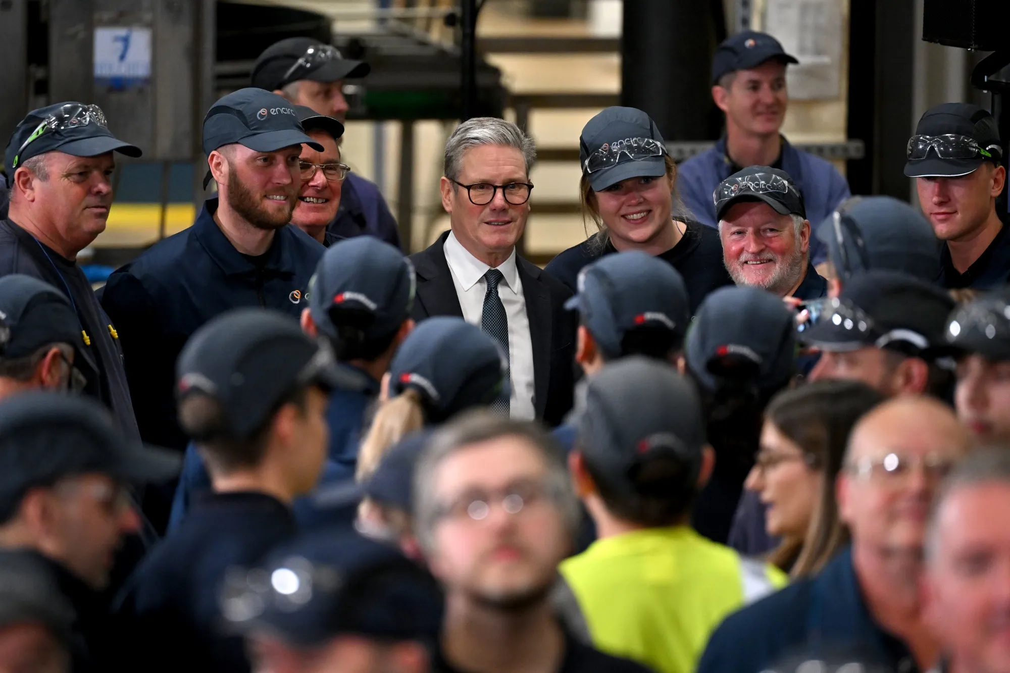 英國首相基爾·斯塔默在訪問切斯特Encirc玻璃廠期間與工人會面。