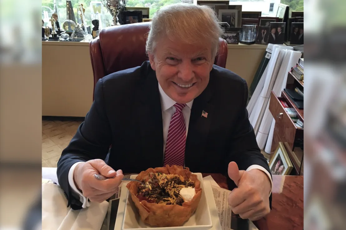 “最好的塔可碗出自特朗普大廈燒烤店,”他在2016年初發推文説道,並分享了一張自己在辦公桌前大快朵頤的照片。“我愛西班牙裔!”